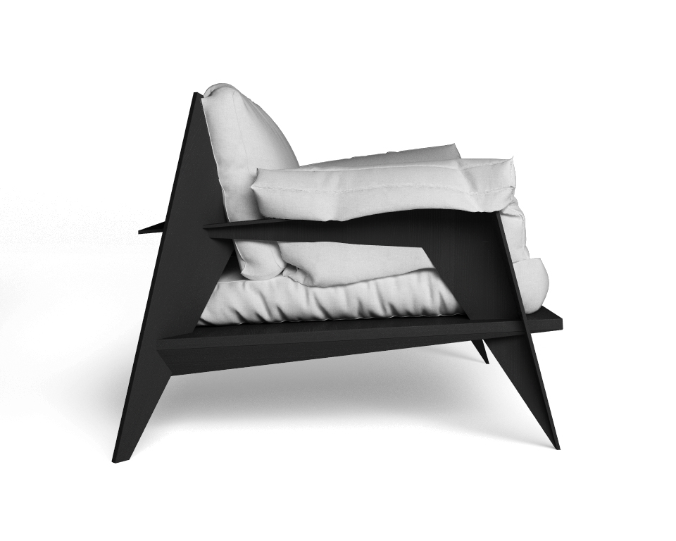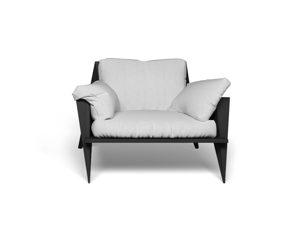 Poltrona in frassino verniciato nero e cuscini in lino bianco