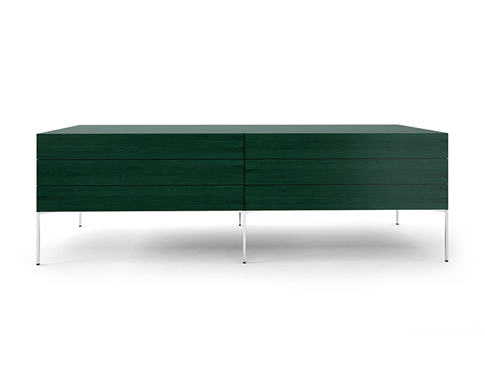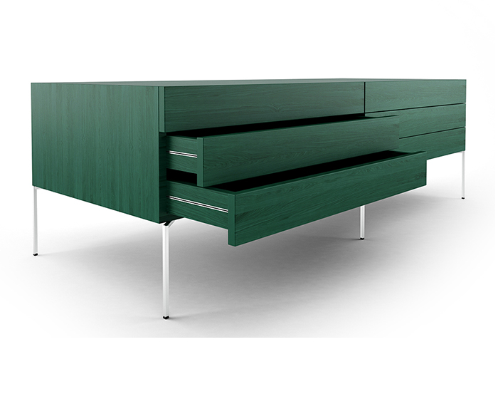 Cassettiera in legno di faggio tinto verde con piedi in acciaio inox sezione quadrata