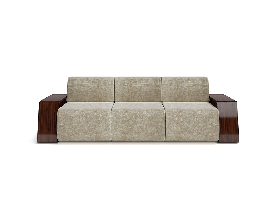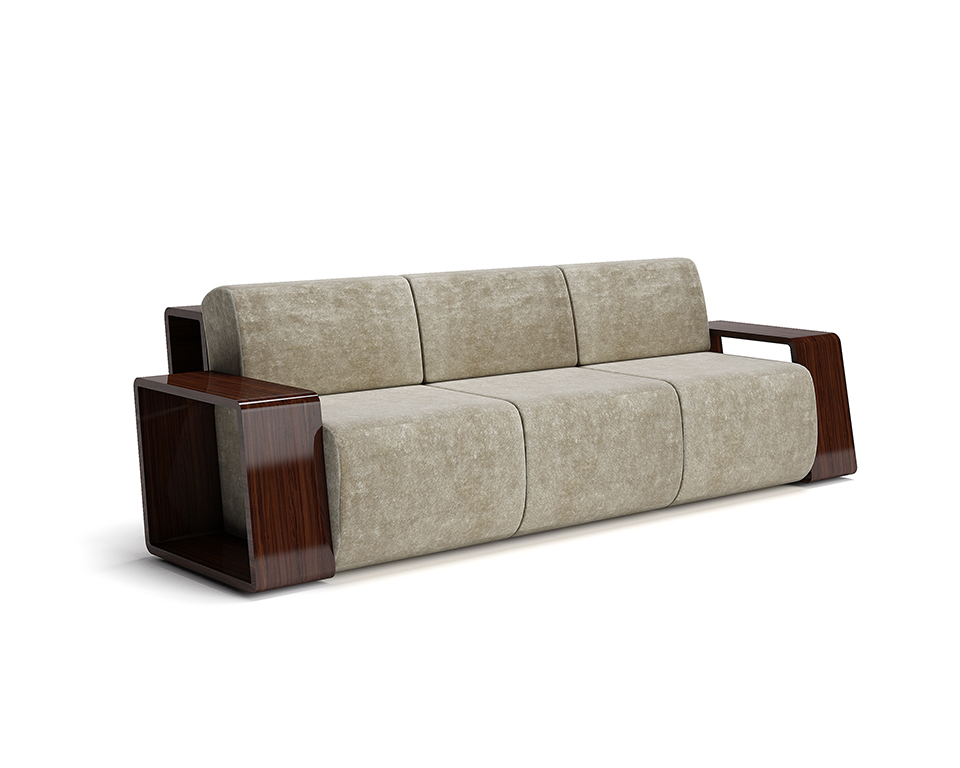 Divano 3 posti in legno di palissandro verniciato lucido e tessuto in velluto di puro cotone