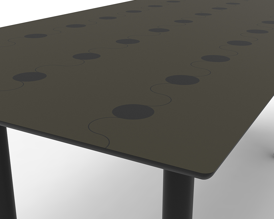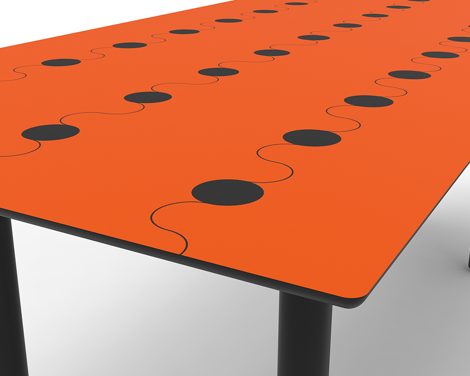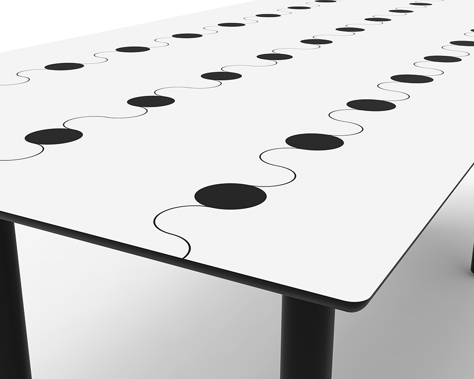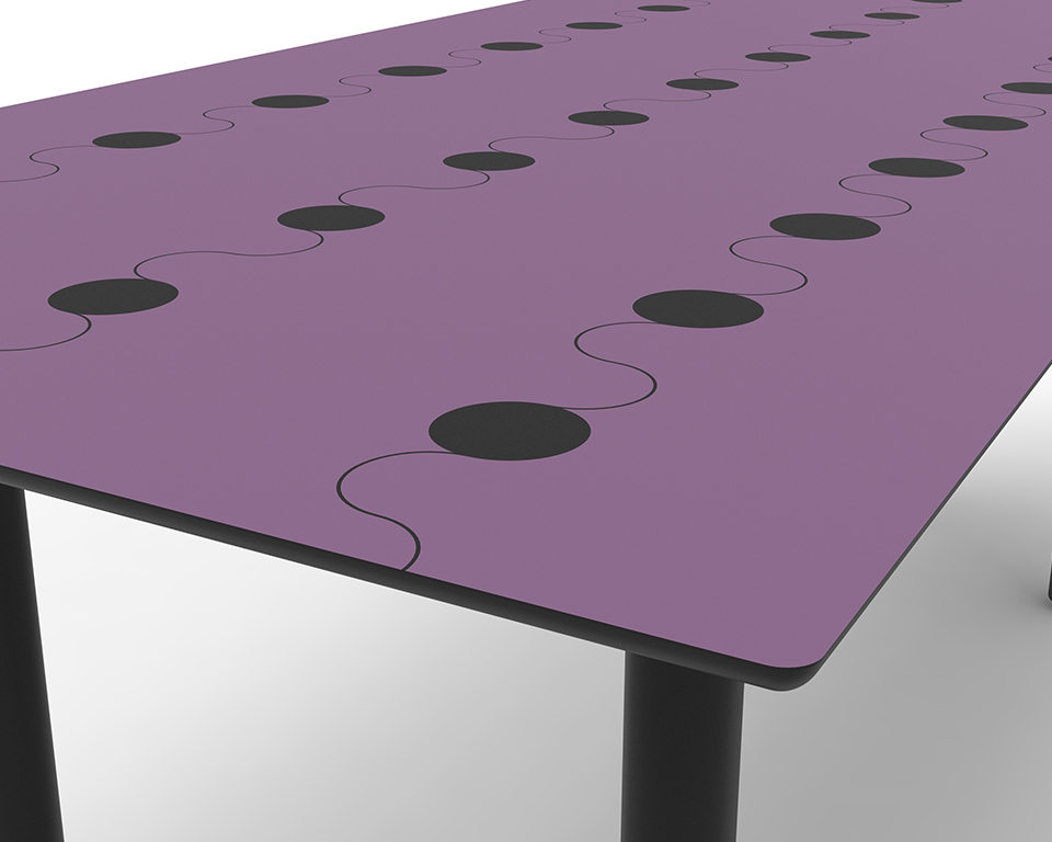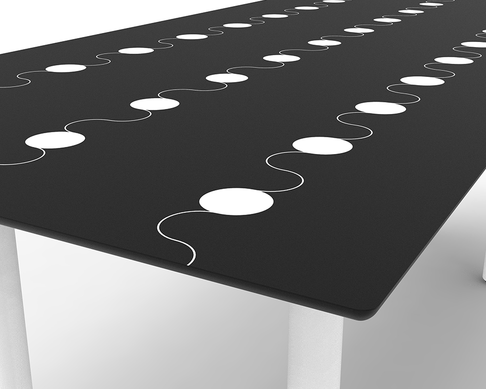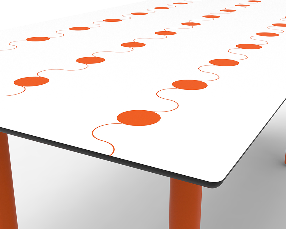 Finiture: Struttura in ferro verniciato opaco a polvere epossidica, bianco, nero o in tinta colore del piano in laminato stampato in digitale