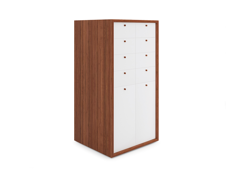 Mobile contenitore in laccato bianco e legno di ciliegio
