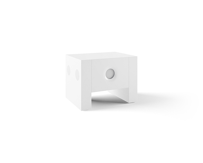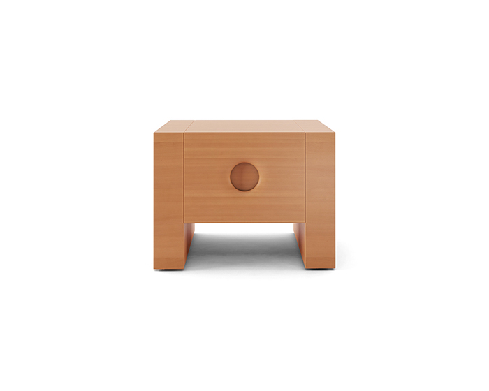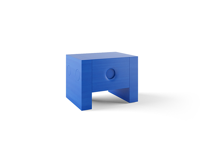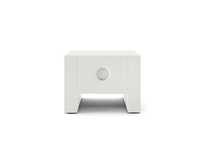 Comodino laccato opaco bianco e maniglie incassate con fondo laccato opaco bianco, in legno di faggio tinto azzurro ed in legno di faggio